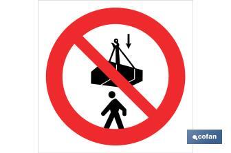 Señal Pictograma "prohibido situarse debajo de la carga" en varias medidas y materiales. El diseño de la señal puede variar, pero en ningún caso se variará el significado de la misma.