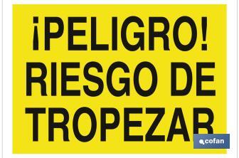 Señal de advertencia de peligro con texto riesgo de tropezar. Tamaño y material a elegir. El diseño de la señal puede variar, pero en ningún caso se variará el significado de la misma.