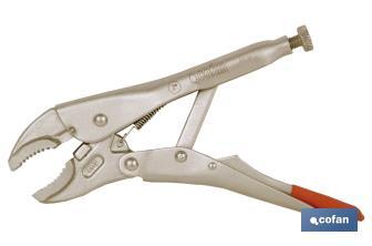 These locking pliers or vice grips have curved jaws. It has a cutter that can be used to cut steel wire with a minimum tensile stress of 140 kg/mm2 at 2.3mm diameter in no more than three progressive clamp settings. It is capable of withstanding a maximum clamp load of 200N.