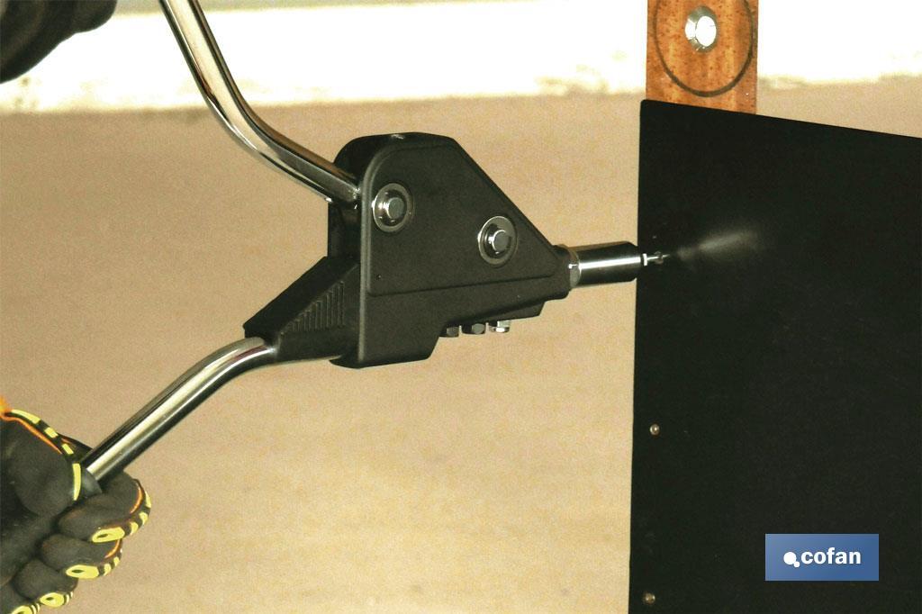 This professional industrial hand rivet tool is intended for rivets. It has an energy saving design, due to the gear containing. It is quick and easy to maintain. It has a container system that provides protection to your eyes and keeps the work area completely clean. It is made from high-quality steel. It has several interchangeable nozzles according to the gauge of the rivet. This tool is perfect for automotive, industrial sectors, as well as for special rivets and structural works.
