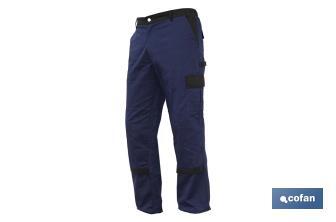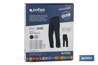 These elastic work trousers, Jano slim fit model, are made of 97.76% cotton and 2.24% elastane, with grammage of 240g/m2. Colour available in navy blue with black details. Available sizes from 38 to 64 (EU). It has several useful pockets that are designed to store all types of tools and objects. These trousers are suitable for any sector, such as industry, construction or agriculture.