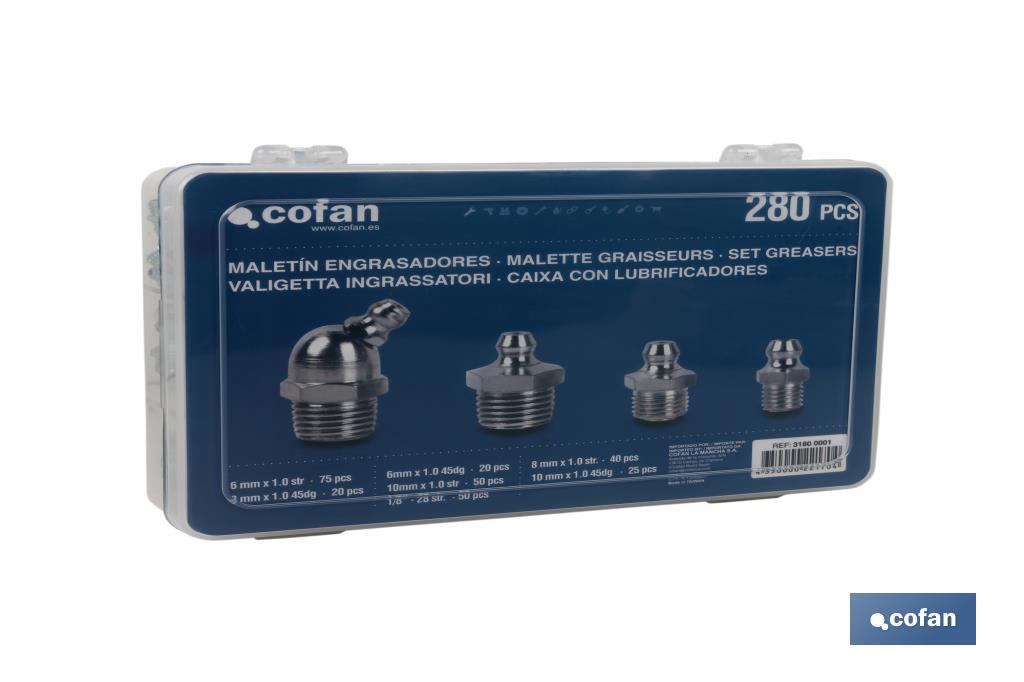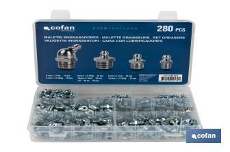 Assorted greasers case. 2 formats, a special one for agricultural use with the most common thread pitches, and another one for industrial use with 90% of the most common metric.