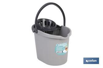 This light grey mop bucket is made of high-quality hard plastic and has a dark grey wringer. It also has an ergonomic handle made of sturdy plastic. It is designed to fill and empty the bucket easily. It has a 14-litre capacity. Bucket size: 37 x 28 x 28cm. Wringer size: 27 x 20 x 16cm.