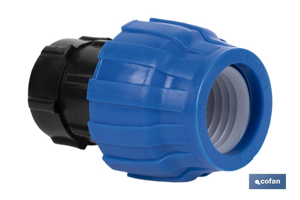 This straight coupling has a BSP female thread and is intended for polyethylene (PE) pipes. Suitable for working on water supply systems with a nominal pressure of 16 bars. It is made of high-quality and highly durable polypropylene, having a black finish and a blue nut. It has EPDM sealing gaskets for a strong and long-lasting tightening and without leakages. Available in different sizes. They are supplied in packs or single unit.