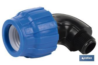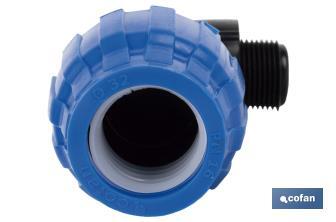 This 90° male elbow coupling has a BSP male thread and is intended for polyethylene (PE) pipes. Suitable for working on water supply systems with a nominal pressure of 16 bars. It is made of high-quality and highly durable polypropylene, having a black finish and a blue nut. It has EPDM sealing gaskets for a strong and long-lasting tightening and without leakages. Available in different sizes. They are supplied in packs or single unit.