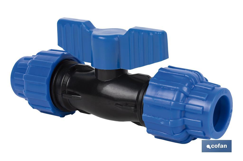 This ball valve coupling has two connections in identical size and is intended for polyethylene (PE) pipes. Suitable for working on water supply systems with a nominal pressure of 16 bars. It is made of high-quality and highly durable polypropylene, having a black finish, two blue nuts and a blue handle. It has EPDM sealing gaskets for a strong and long-lasting tightening and without leakages. Available in different sizes. They are supplied in packs or single unit.