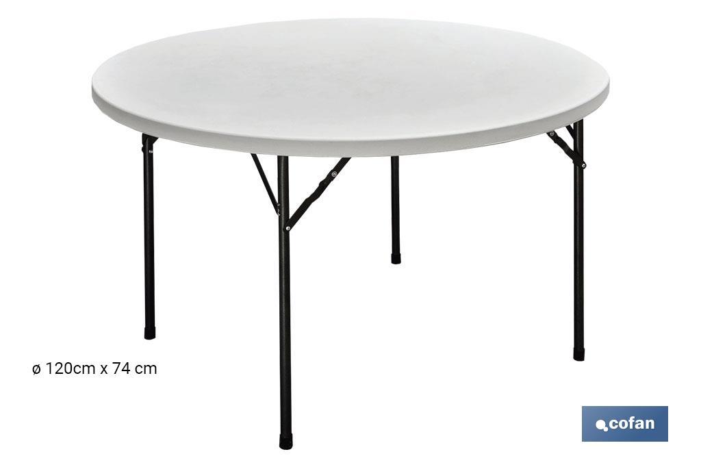 White round folding table made of high-density polyethylene (HDPE) and painted steel frame. This table has been designed to offer durability both indoors and outdoors. It also withstands extreme temperatures, as well as moisture and UV rays for year-round durability. Its folding frame, easy to open and close, allows for easy storage, as it takes up little space. It also has an integrated handle that makes it easy to carry. It has sturdy crossbars and legs and a 45mm thick fixed base. It provides a stable surface for 6 or 8 people, bearing loads of up to 150kg. Ideal for events or celebrations, as well as auxiliary table in garden, camping, terrace, special tasks, etc. Dimensions when closed: Ø120 x 8.4 cm. Dimensions open: 120 in diameter and 74cm high. Net weight: 13.5kg.