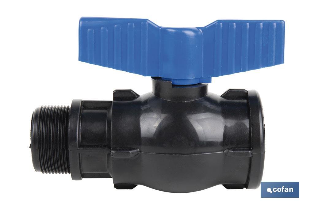 This ball valve has a BSP male thread and other BSP female thread in identical size and is intended for polyethylene (PE) pipes. Suitable for working on water supply systems with a nominal pressure of 16 bars. It is made of high-quality and highly durable polypropylene with black finish and blue lever. Available in different sizes. It is supplied in packs or in single units, depending on the size.