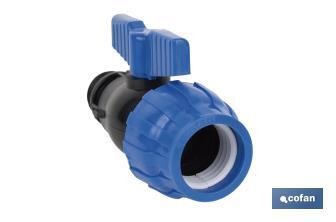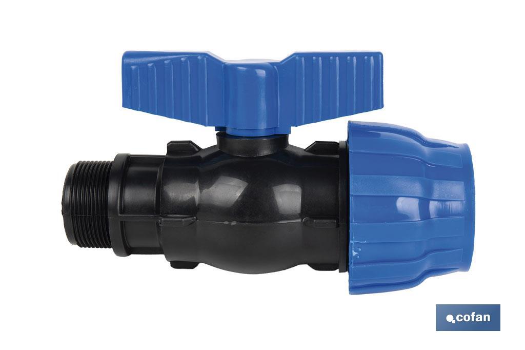 This ball valve coupling has a BSP male thread and is intended for polyethylene (PE) pipes. Suitable for working on water supply systems with a nominal pressure of 16 bars. It is made of high-quality and highly durable polypropylene, having a black finish and a blue nut and lever. It has an EPDM sealing gasket for a strong and long-lasting tightening without leakages. Available in different sizes. It is supplied in packs or in single units, depending on the size.