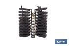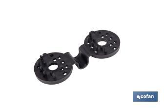 Shade cloth clips intended for placing and attaching shade nets to posts or walls. The cloth can be secured by chewing these toothed clips into it and making a hole through which a rope or wire can be passed. In this way, a strong and secure fixing to the wall or post is achieved. They are made of polypropylene and are available in black. They are supply in packs of 10 units.