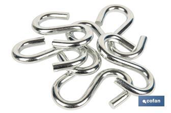Gancho en "S" zincado ideal para la colocación de objetos en barras o cornisas. También usado para empalmes de cadena de pequeño calibre.