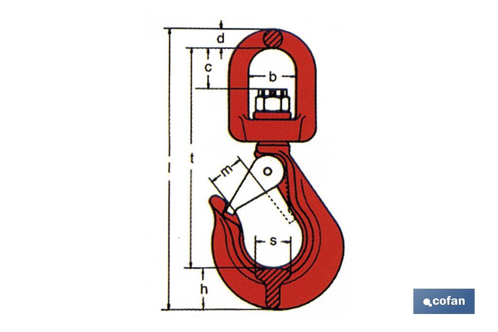 Rotatory hook with clasp and body made of hardened carbon steel C40, with rotatory shackle for an easier transportation of the load. It prevents from tangles and overturns.