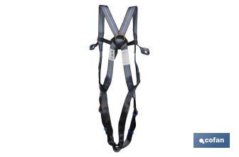 Arnés anticaídas con 2 puntos de enganche esternal y dorsal. También la parte de los muslos es ajustable y la correa de asiento es idónea para una mayor comodidad y ergonomía a la hora de utilizarlo. La parte de los hombros y los muslos están diferenciadas en dos colores. Soporta un peso de hasta 140 kg. El arnés pesa 0,79 kg es muy ligero y cómodo para transportar. Está fabricado en tejido de poliéster de muy buena calidad.