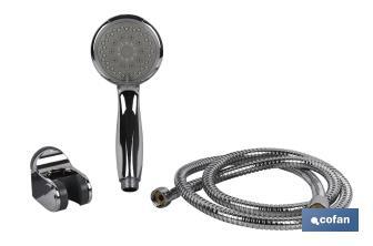 Kit de ducha modelo ABS cromado. Cuenca con 5 funciones y está compuesto de un mango de ducha con 5 posiciones de hidroterapia y salidas anti cal, de un flexo extensible inoxidable con racores en latón y de un colgador de pared para el mango de la ducha. El mango mide 10,5 x 25 cm. El flexo cuenta con una longitud de 1,5 m. El mango está fabricado en ABS cromado de gran durabilidad y poco peso. De fácil mantenimiento y limpieza. Moderno y funcional con su diseño redondo. Compatible con los sistemas de ducha y baño estándar del mercado.