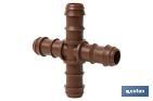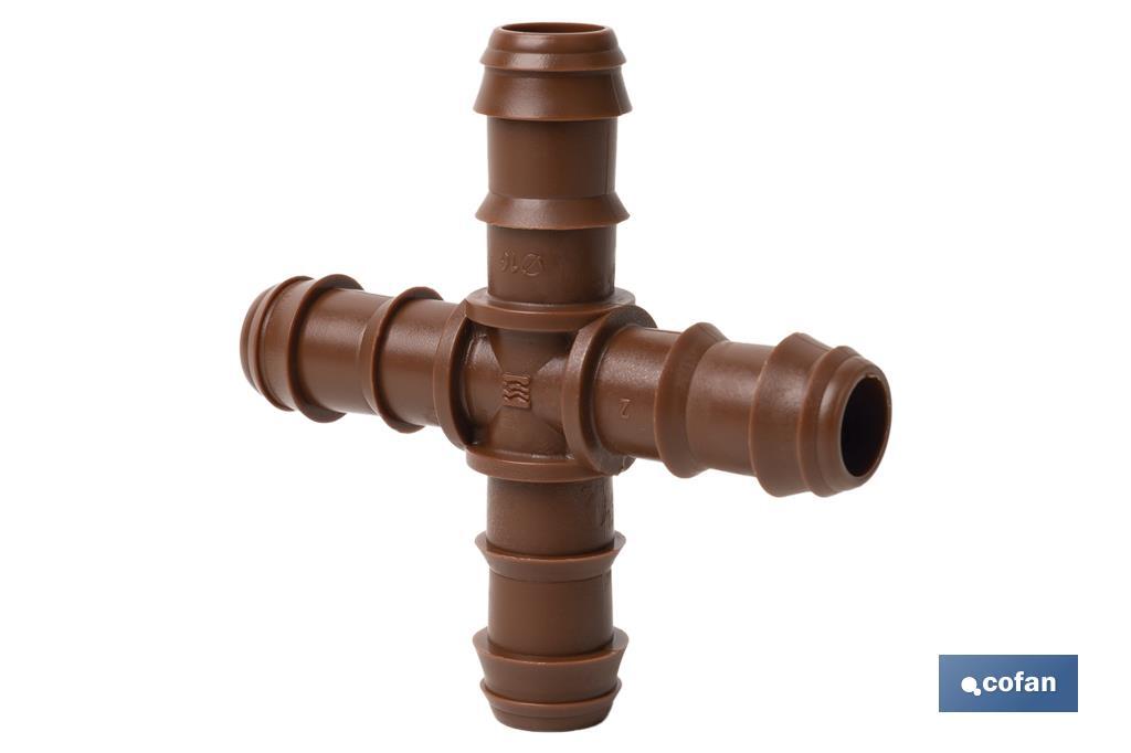 Conector en cruz para riego por goteo ideal para agricultura y jardinería. Su diseño estriado permite su fácil montaje, sin necesidad de herramientas adicionales, uniendo tramos de manguera sin riesgo de fugas. Gracias al conector de cruz se pueden llevar a cabo diferentes tipos de combinaciones, adaptándose a los distintos tipos de riego. Este producto es perfecto para realizar combinaciones en las conexiones de un sistema de riego. El uso de conexiones en cruz es fundamental para generar circuitos funcionales en los sistemas de riego de la agricultura y jardinería. Su material es resistente y aporta al producto la resistencia suficiente para que sea funcional en escenarios donde las condiciones medioambientales sean adversas.