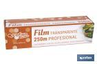 Film transparente para uso profesional con estuche de sierra de corte. Medida disponible de 250 metros y ancho de 30 cm. Protege y conserva el sabor y la frescura de los alimentos en el frigorífico o congelador, evita la pérdida de humedad, y la transmisión de olores. Es muy práctico para poner en todo tipo de recipientes. Lámina autoadherente que permite recuperar la flexibilidad y resistencia.