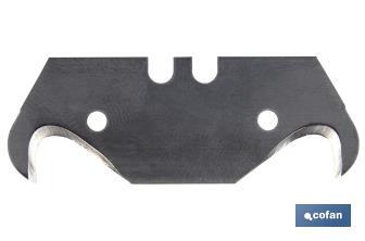 Repuesto de 5 cuchillas tipo gancho para cúter. Las hojas están fabricadas en acero de alta calidad, afiladas y de alta duración. Cambiar la hoja del cúter es muy sencillo, únicamente tendrás que retirar la sujeción de la parte trasera y hacer la cuchilla antigua, seguidamente incluye la nueva sujetándola y cierra el cúter. Ideal para cúter Zamak.