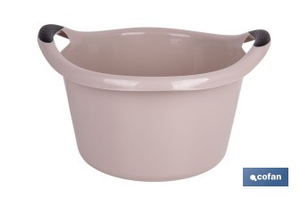 Barreño redondo con asas con capacidad para 15 litros. Es cómodo y práctico para lavar, guardar cosas y transportar a cualquier lugar. Tiene múltiples usos. Además, es resistente y duradero. También es apto para uso alimentario. Disponible en dos colores: gris y beige oscuro. Fabricado en polipropileno de alta calidad. Este barreño es muy versátil ya que puedes utilizarlo para diferentes funciones en el hogar. Las medidas de los barreños son de 42 x 39.5 x 25 cm.