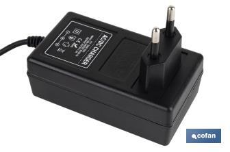 Cargador apto para batería recargable Cofan Li-ion 25 V 2.0 Ah (referencia 5003501.01). Dispone de dos cables para poder cargar dos baterías simultáneamente. Incluye un indicador LED, el cual se iluminará de color rojo mientras se cargan las baterías y en color verde una vez la carga se haya completado al 100 %. Esta operación puede completarse en 1 o 2 horas. Nº RII-AEE de Cofan La Mancha: 7038.
