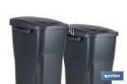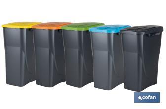 Cubo de reciclaje verde con tapa manual que puede abrirse y cerrarse mediante pulsador. Adecuado para reciclar materiales de vidrio. Fabricado en polipropileno de color gris con una tapa de color verde. El cubo de reciclaje puede unirse lateralmente, mediante un anclaje, a otros cubos de varios colores para crear así una estación de reciclaje. Son adecuados para el hogar, así como para colegios, oficinas, cocinas y talleres de cualquier modalidad. Sus dimensiones permiten que este cubo encaje en cualquier lugar y ambiente, por lo que puedes utilizarlo en cualquier lugar que desees, ya sea cocina, hogar, oficina o jardín. Adecuado para interiores y exteriores. De fácil limpieza y mantenimiento. Disponible en tres medidas a elegir: 20 x 31 x 42 cm (con 15 litros de capacidad), 21,5 x 36 x 51 cm (con 25 litros de capacidad) y 36,5 x 36 x 51 cm (con 45 litros de capacidad).