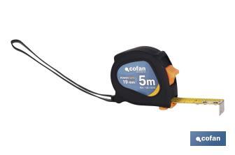 Flexómetro antideslizante recubierto totalmente en goma con medidas en 3, 5 y 8 metros de longitud.