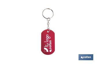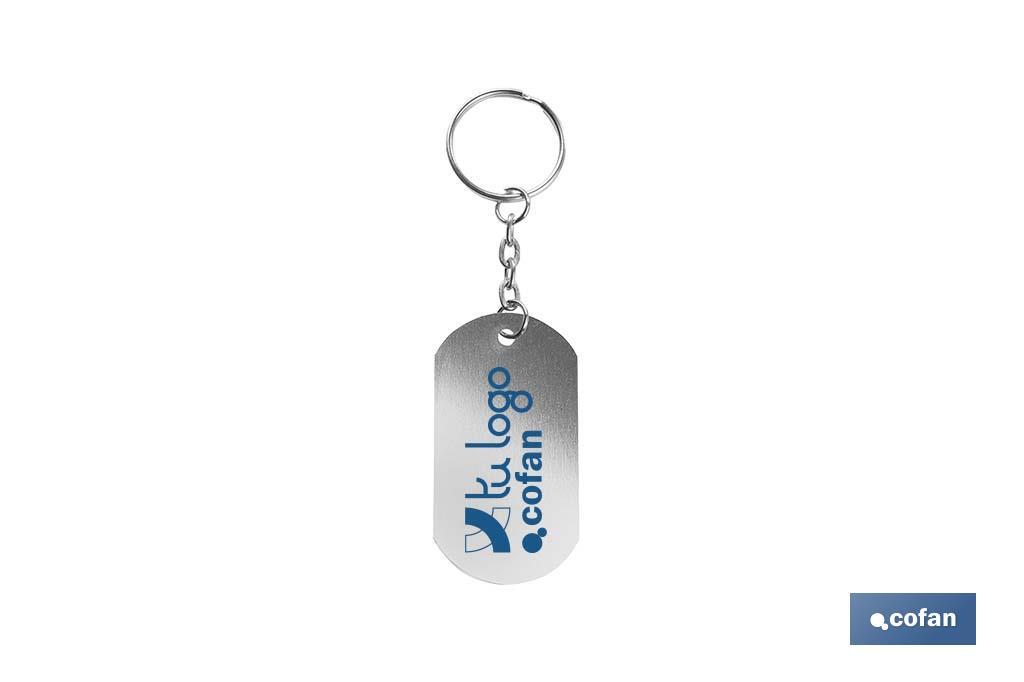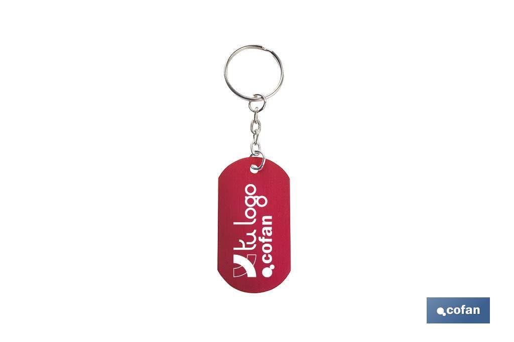 Llavero chapa con cuerpo de aluminio en variados y vivos colores. Especialmente diseñado para marcaje en láser. Logotipo de Cofan incluido en el diseño. Cantidad mínima 100 unidades