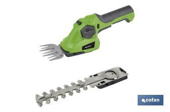 Corta sebes e corta relva a batería. Ferramenta ideal para a manutenção de sebes, pequenos arbustos e orlas de relva. Funciona com uma bateria de lítio de 3,6 V. O sistema de lâmina intercambiável foi projetado para torná-lo mais fácil e rápido. Inclui bateria e carregador. É uma ferramenta muito compacta e prática com um sistema antibloqueio para maior desempenho de corte. Vida útil da bateria de aproximadamente 1 hora. Número REI-WEEE de Cofan La Mancha: 7038.