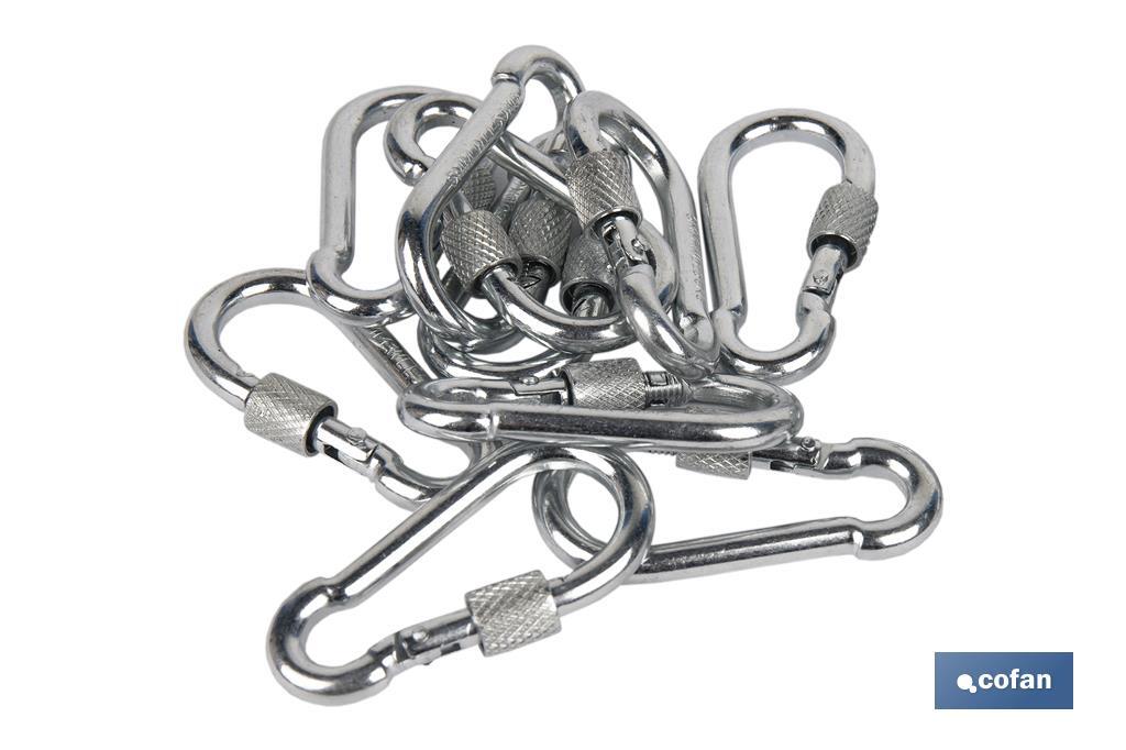 Available from 60mm up to 160. Also in A-2 and A-4 stainless steel, the carbine hook has a rough clasp for a faster fastening.